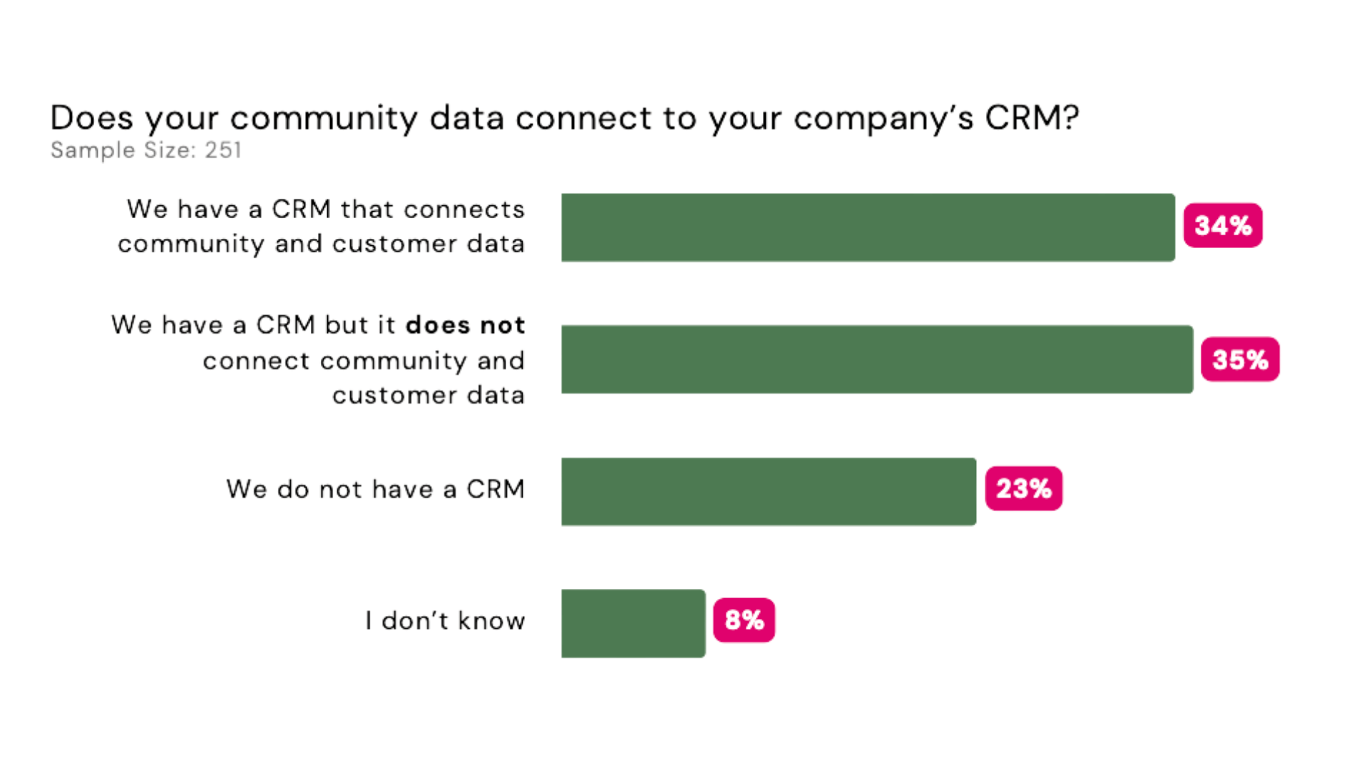 Os dados mostram que, embora comunidades estejam diretamente ligadas a resultados como suporte, aquisição e retenção, poucas organizações conseguem conectar de forma consistente essas iniciativas a métricas de negócio. Um dos exemplos mais claros é a integração com CRM: apenas uma parcela das empresas conecta dados de comunidade com dados de clientes.