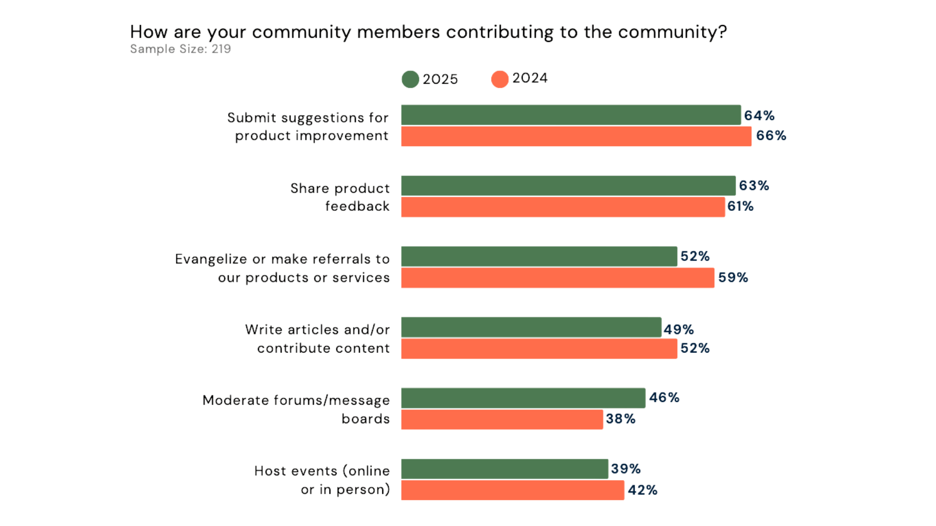 Os dados mostram uma redução em comportamentos tradicionalmente associados ao engajamento visível, como criação de conteúdo, advocacy e organização de eventos por parte dos membros. Ao mesmo tempo, há um crescimento em atividades menos visíveis, como moderação, suporte e participação em discussões mais operacionais.