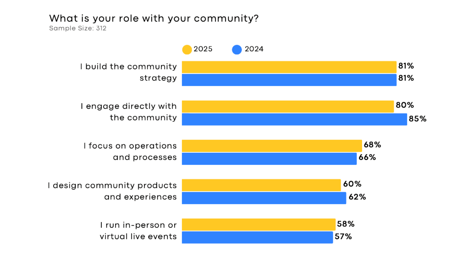 O CMX Report mostra uma mudança relevante no perfil desses profissionais. Há uma redução na proporção de pessoas dedicadas exclusivamente à comunidade e um aumento na atuação híbrida, com responsabilidades compartilhadas entre marketing, conteúdo, comunicação e outras áreas.