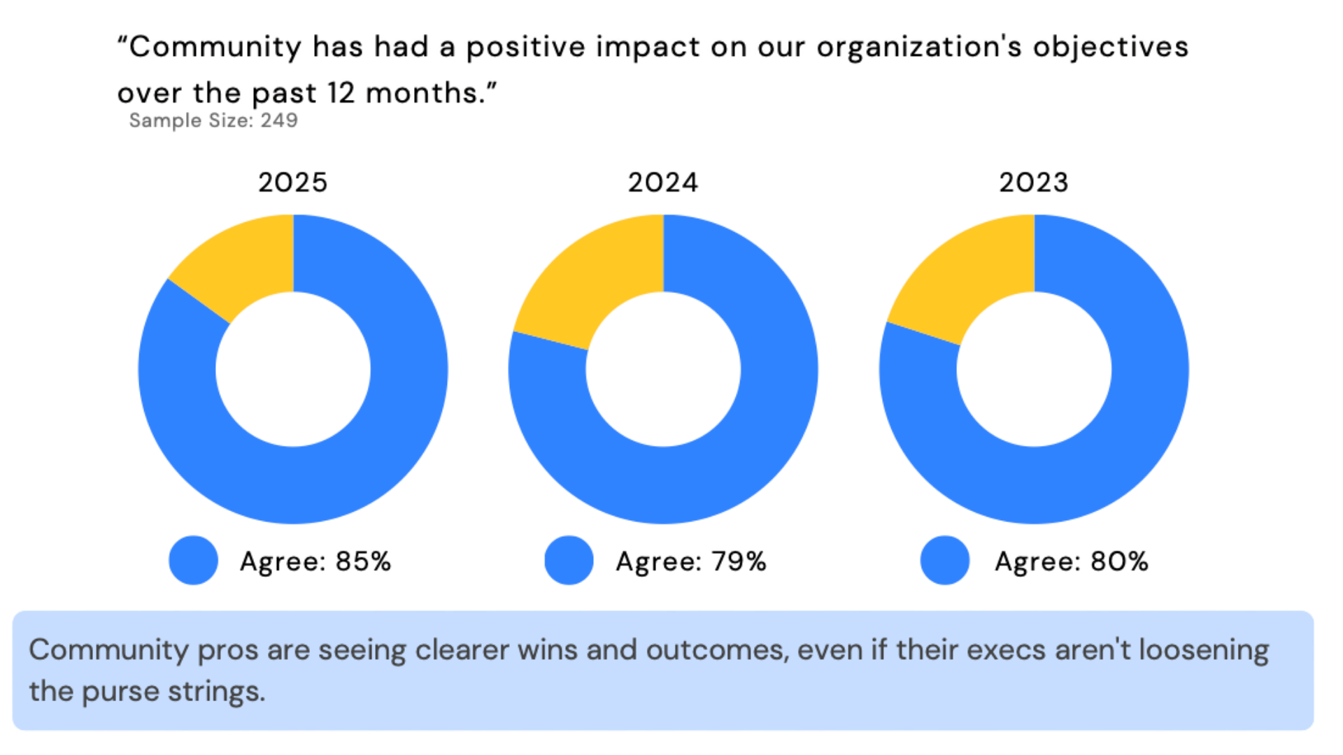 Esse movimento também se reflete na forma como o impacto é percebido internamente. A maioria dos respondentes afirma que a comunidade teve impacto positivo nos objetivos da organização e que sua importância estratégica continua crescendo.